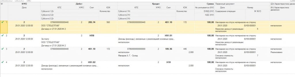 Далее заполняем КФО, на которое мы оприходовали металлолом и МОЛ.