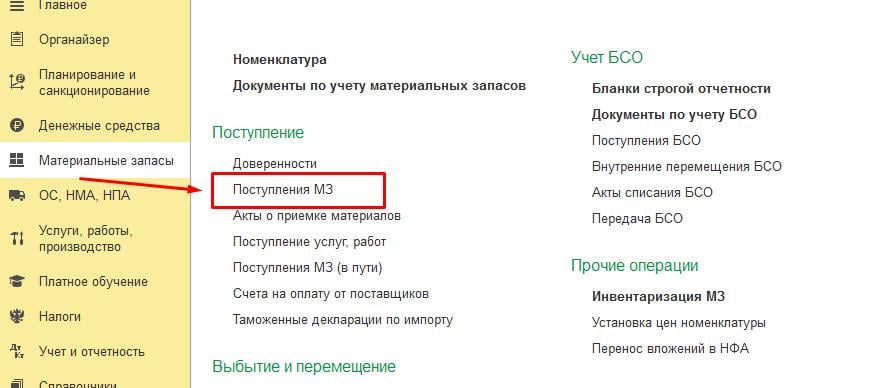 Для этого используем документ «Поступление МЗ» в разделе материальные запасы.