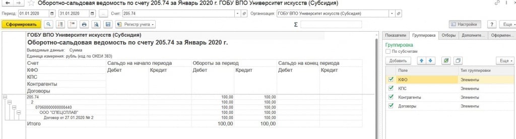 Обязательно проверяем с помощью стандартных отчетов, что счет 205.74 закрыт в разрезе КПС, КФО, контрагента и договора, для корректного заполнения в дальнейшем регламентированных отчетов.