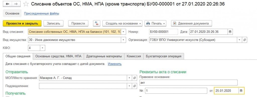 На закладке «Общие сведения» указываем МОЛ, реквизиты акта списания.