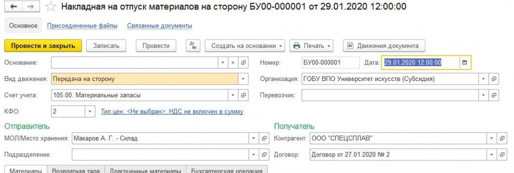 Выбираем вид движения - Передача на сторону. Счет учета - 105.00. Материальные запасы.