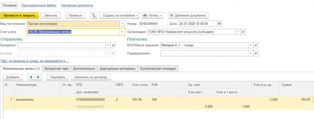 Вид поступления в документе «Прочее поступление, счет учета - 105.00. Материальные запасы.