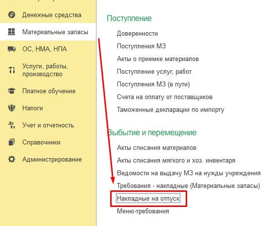 Сделаем это с помощью документа «Накладная на отпуск». Данный документ находится в разделе Материальные запасы.