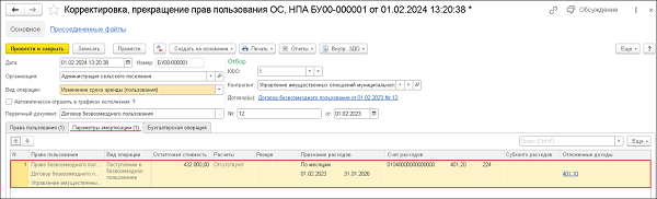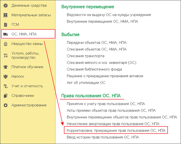 1. Для продления прав пользования объектом предназначен документ "Корректировка, прекращение прав пользования ОС, НПА" из раздела "ОС, НМА, НПА - Права пользования, ОС, НПА".