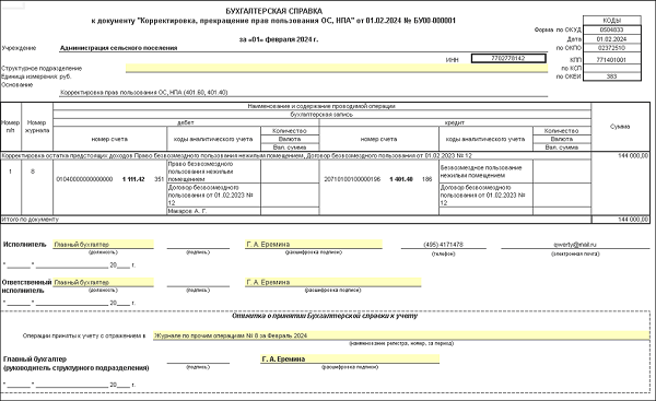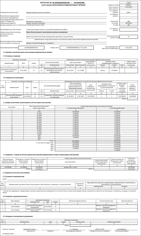 Администрация сельского поселения 01.02.2023 заключила договор безвозмездного бессрочного пользования нежилым помещением с Управлением имущественных отношений муниципального района. Право пользования объектом по справедливой стоимости арендных платежей принято на 3 года. Справедливая стоимость арендных платежей составляет 12 000 руб. в месяц. 01.02.2024 продлено право пользования нежилым помещением на очередной финансовый год.