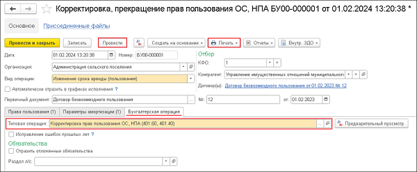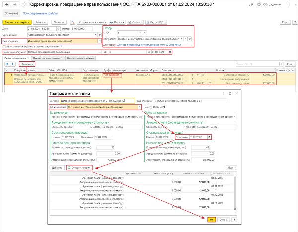 В созданном документе указывается вид операции "Изменение срока аренды (пользования)".