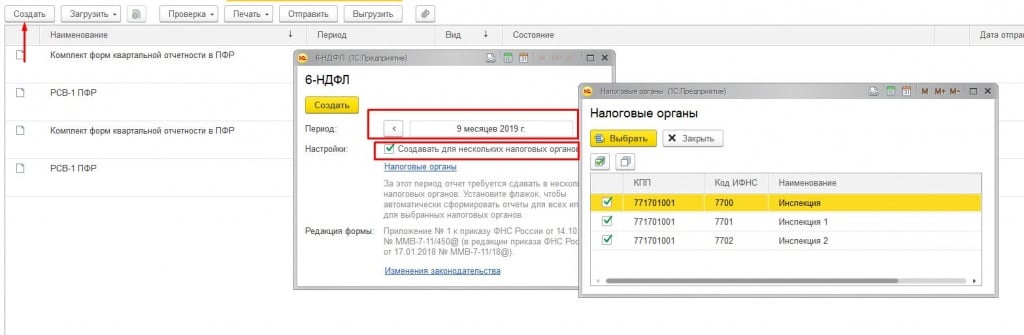 Создаем новый отчет 6-НДФЛ, выбираем период и устанавливаем «галку» - «Создавать для нескольких налоговых органов».