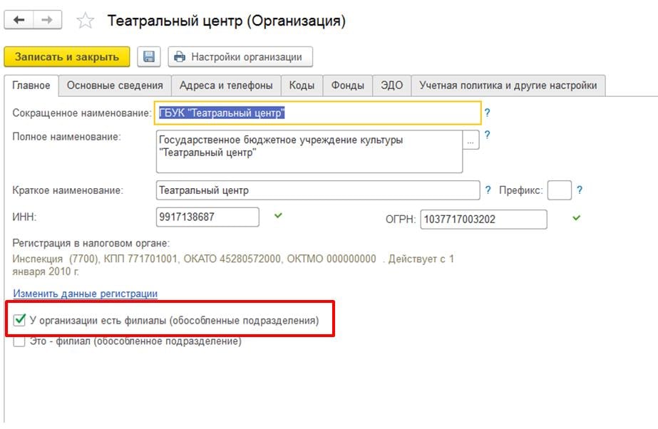 Первое, что нужно сделать для корректного формированию отчетов по разным ОКТМО, необходимо в «Реквизитах организации» поставить «галку» - «У организации есть филиалы (обособленные подразделения)».