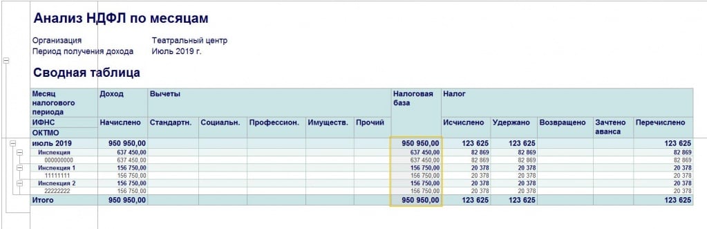 Для того чтобы проверить себя верно ли все начислено по ОКТМО, можно воспользоваться отчетом «Анализ НДФЛ по месяцам».