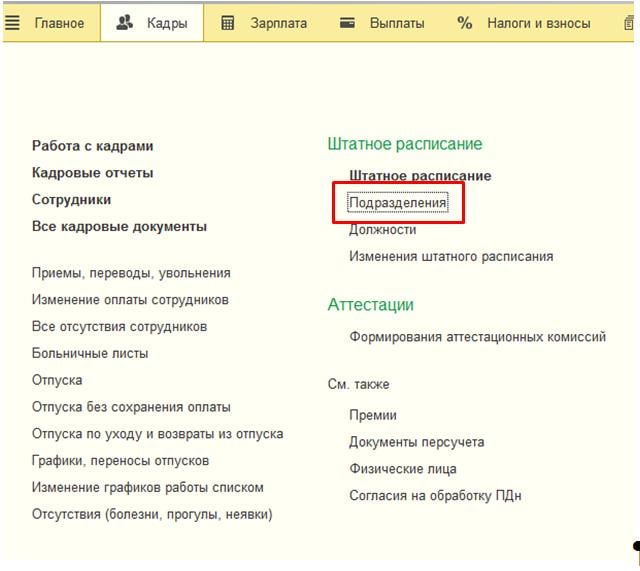 Далее, на закладке «Кадры» перейти в справочник «Подразделения».