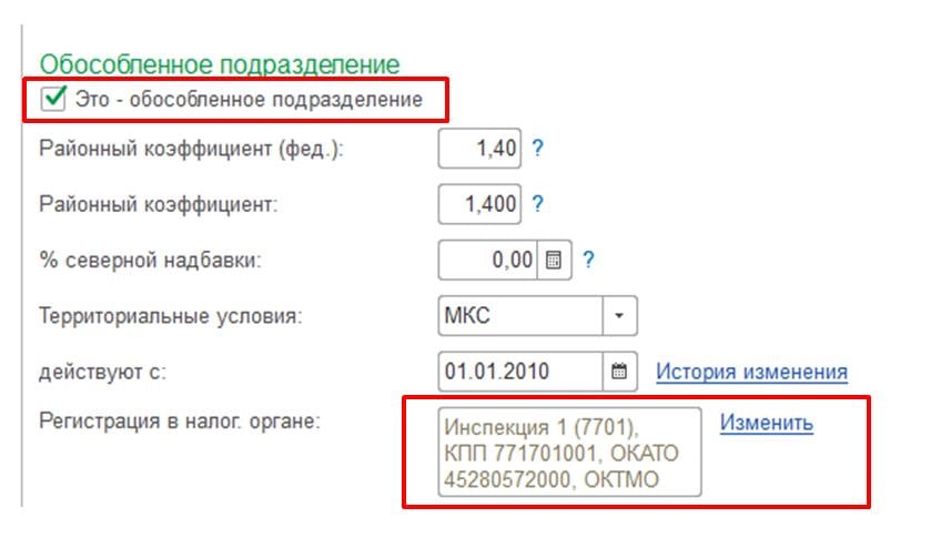 Для каждого подразделения, у которого регистрация в налоговом органе отличается от регистрации организации (т.е. разные ОКТМО) необходимо в карточке подразделения установить «галку» - «Это – обособленное подразделение» и заполнить по гиперссылке «Изменить» регистрацию в налоговом органе.