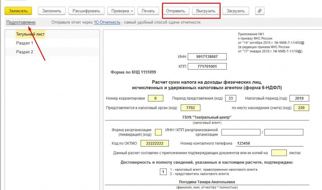 Далее заходим в каждую форму и проверяем суммы. Затем если все верно, меняем статус отчета на «Подготовлено» и можно или сразу отправить отчет через 1С-Отчетность по кнопке «Оправить» или выгрузить форму для отправки через стороннюю программу.