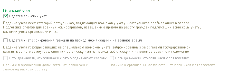 Для ведения воинского учета, необходимо включить соответствующую настройку (раздел Настройка — Кадровый учет). Должен быть установлен флажок «Ведется воинский учет».