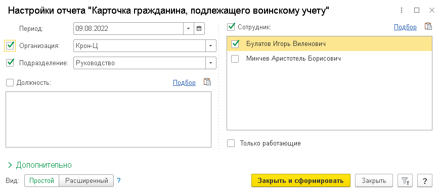 Для изменения настроек отчета нажмите на кнопку Настройки, в открывшейся форме есть возможность настроить: подразделение, должность, сотрудника; далее нажмите Закрыть и сформировать.