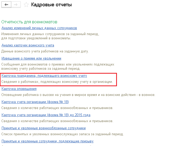 Теперь в программе будут доступны отчеты для военкоматов, в том числе отчет «Карточка гражданина, подлежащего воинскому учету». Отчеты доступны в разделе Кадры — Кадровые отчеты.