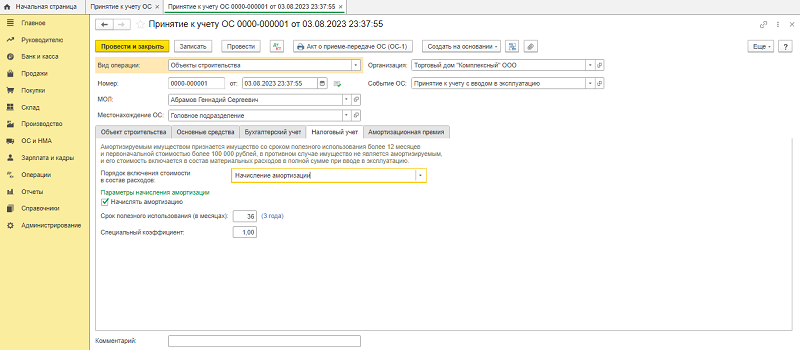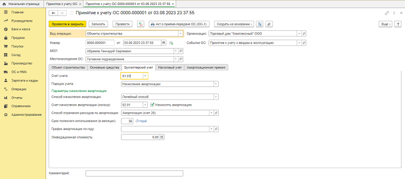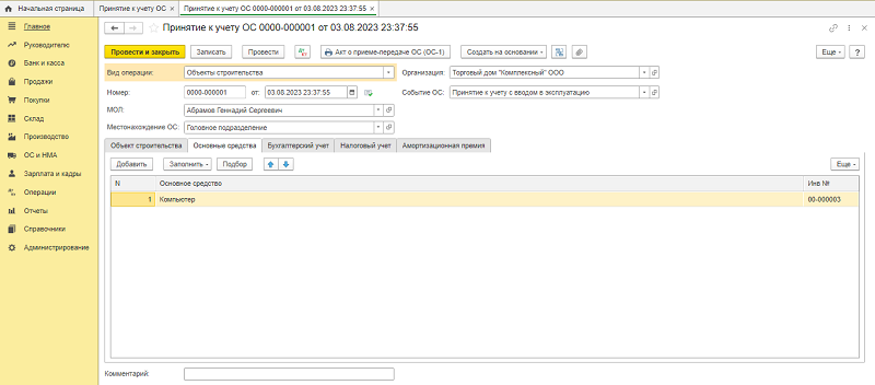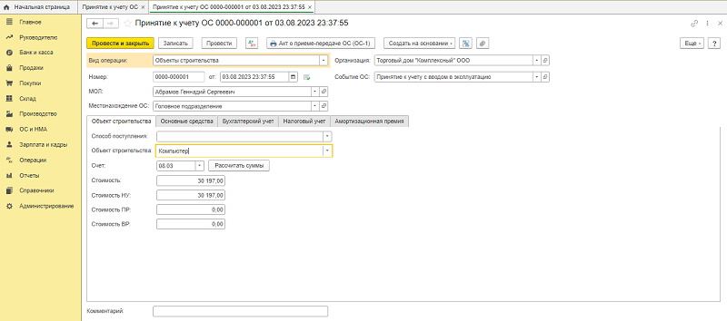 Последним этапом является прием ОС. Для этого перейдем в раздел «ОС и НМА» - «Принятие к учету ОС» - Создать. В поле «Событие ОС» необходимо указать - принятие к учету с вводом в эксплуатацию, в поле МОЛ – материально ответственное лицо, в поле местонахождение ОС – место, где будет установлено ОС. На вкладке «Объект строительства» укажем название объекта строительства, счет - 08.03 после чего нажмем кнопку «Рассчитать суммы» - рассчитается стоимость объекта. На вкладке «Основные средства» в табличную часть добавим основное средство, а также заполним вкладки бухгалтерский и налоговый учет.