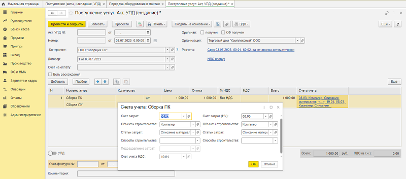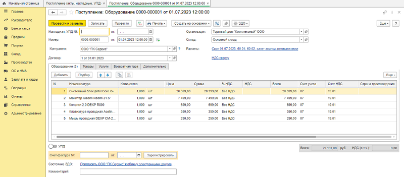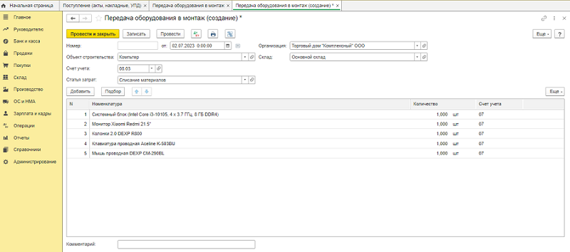1 этап: прием комплектующих на склад. Операцию проведем с помощью документа Поступление оборудования. Счет учета необходимо поставить 07 «Оборудование к установке».