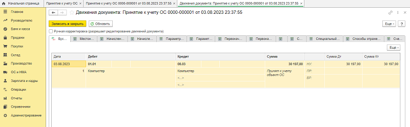 После проведения документ сформирует следующие проводки: Дт 01.01 - Кт 08.03.