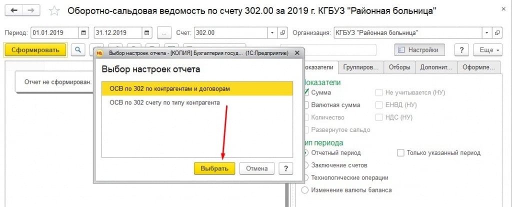 В открывшемся окне выбираем нужную нам строчку, в нашем случае «ОСВ по 302 счету по типу контрагент» и нажимаем на кнопку «Выбрать».