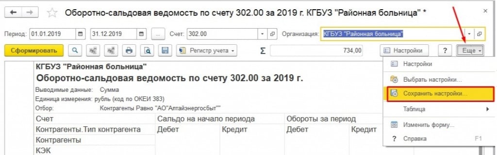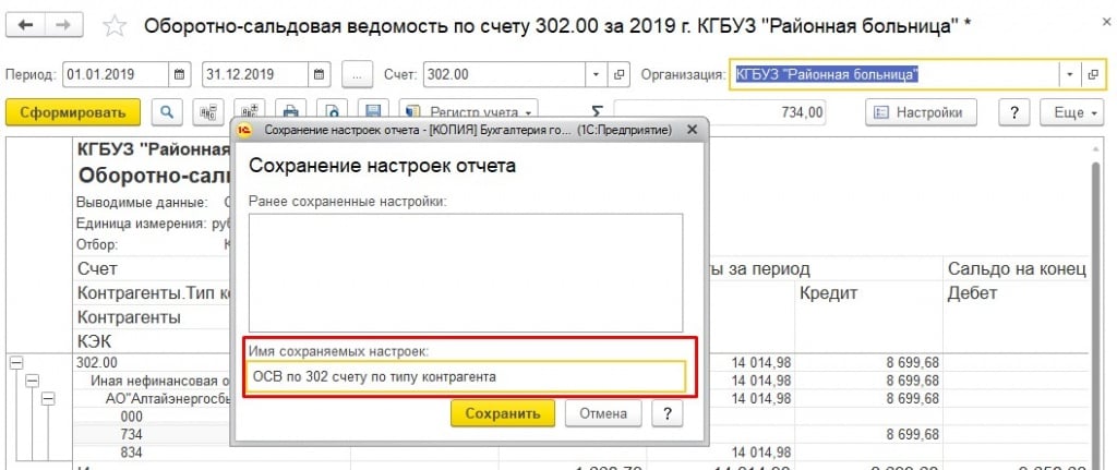 В открывшейся форме вводим имя сохраняемых настроек, в нашем случае «ОСВ по 302 счету по типу контрагент» и нажимаем на кнопку «Сохранить».