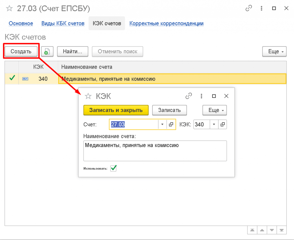 5. Создаем КЭК 340, указываем наименование идентичное названию счета и обязательно ставим галочку «Использовать».