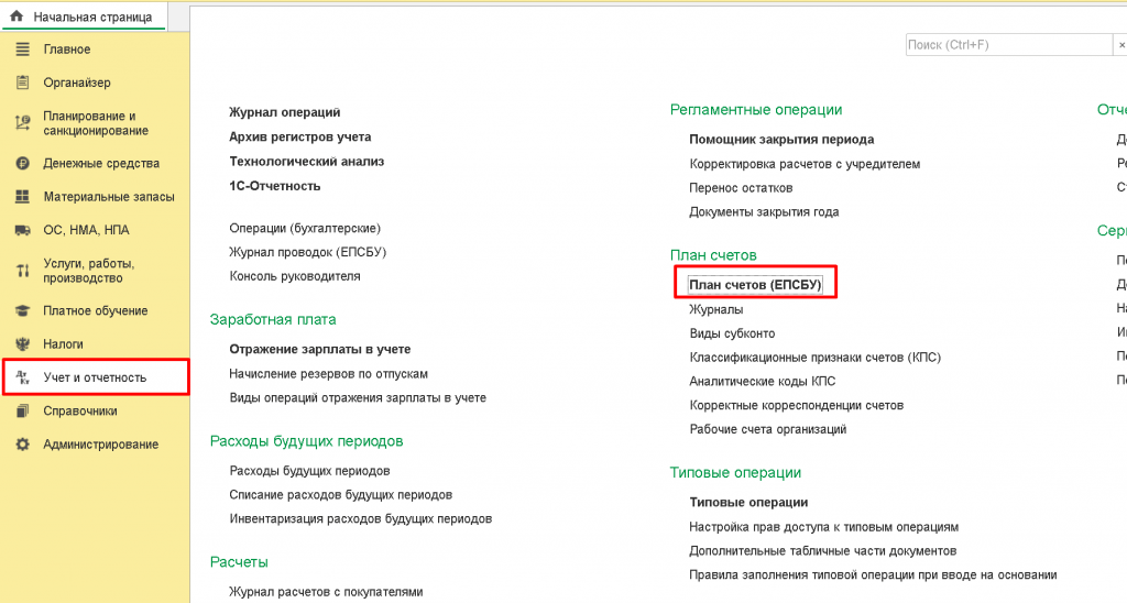 1. Нужно перейти в раздел Учет и Отчетность – План счетов (ЕПСБУ).