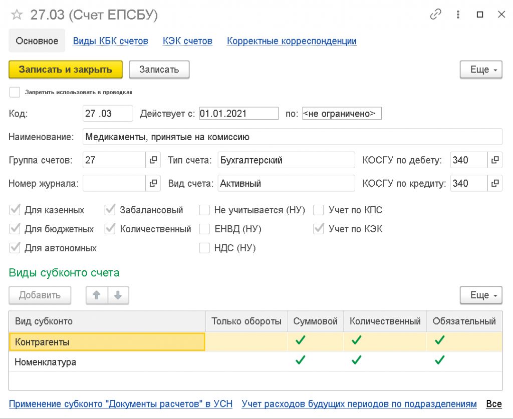 Проставить галочки - Забалансовый, количественный, Учет по КЭК. После указания последнего, появятся поля «КОСГУ по дебету» и «КОСГУ по кредиту», в обоих указываем 340.