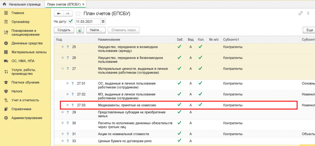 Нам всё чаще начали поступать вопросы о добавлении нового счет, 27.03 «Медикаменты, принятые на комиссию», в план счетов. Это связано с тем, что Министерство Здравоохранения хочет вести учет медикаментов, которые реализуются на ФАПах. Поэтому разберем вопрос, как же создать данный счет в программе 1С: Бухгалтерия государственного учреждения, ред. 2.0.