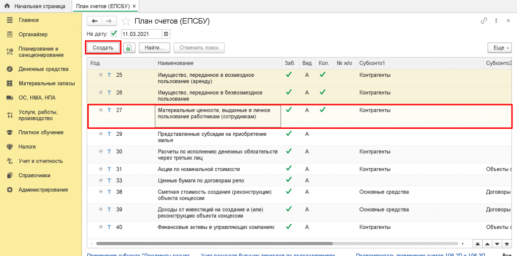 2. Выделить группу счетов 27 и нажать кнопку «Создать».