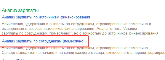 Выбираем отчет «Анализ зарплаты по сотрудникам (помесячно)» или «Анализ зарплаты по источникам финансирования» (рис.2).