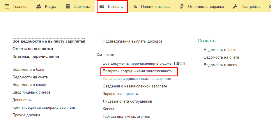 Для этого можно воспользоваться документом «Возврат сотрудниками задолженности». Он находится в разделе «Выплаты» (рис.6).