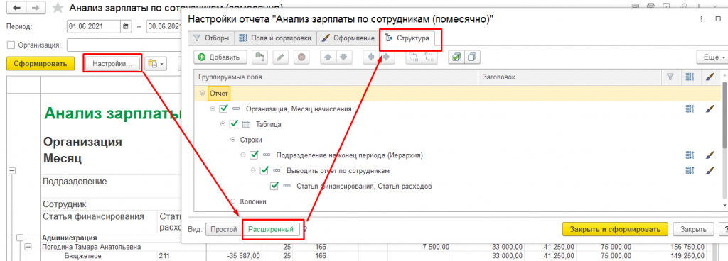 Для настройки отчета по статьям финансирования необходимо перейти в «Настройки», выбрать «Вид» - «Расширенный» и перейти на закладку «Структура».