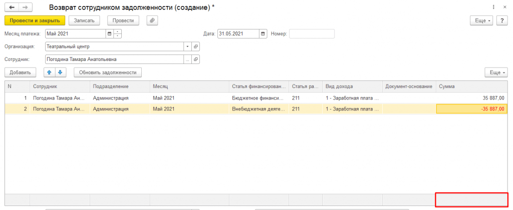 Создаем новый документ, далее выбираем сотрудника, у которого есть «пересорт» по статьям финансирования.