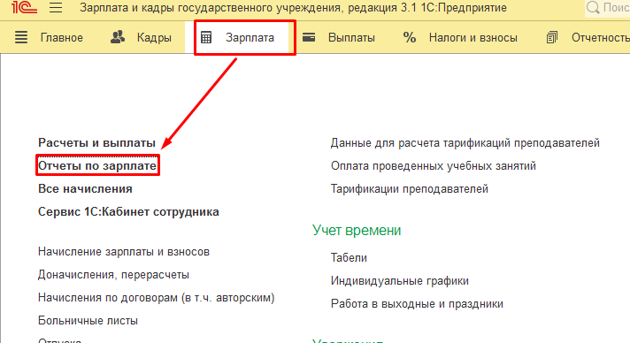 Раздел «Зарплата», далее выбираем пункт «Отчеты по зарплате» (рис .1).