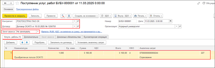 3.1. Для отнесения на расходы будущих периодов страховой премии за весь срок полиса ОСАГО используется документ «Поступление услуг, работ» в разделе «Услуги, работы, производство».