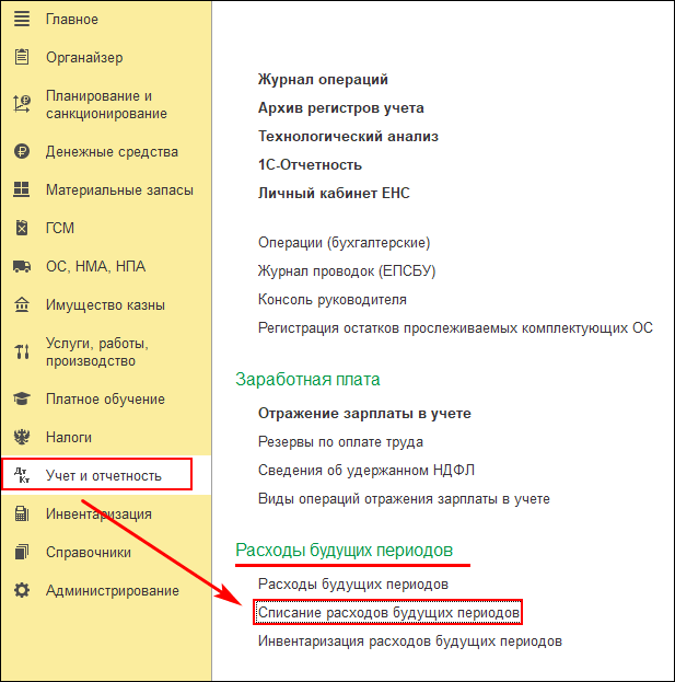 5.1. Для отражения ежемесячного отнесения расходов будущих периодов на затраты текущего года используется документ «Списание расходов будущих периодов» в разделе «Учет и отчетность».