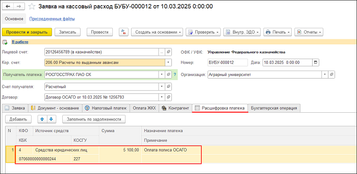 2.1. Для отражения перечисления единовременного авансового платежа за полис ОСАГО используется документ «Заявка на кассовый расход» в разделе «Денежные средства» - «Банк (казначейство)» - «Расчетно-платежные документы».