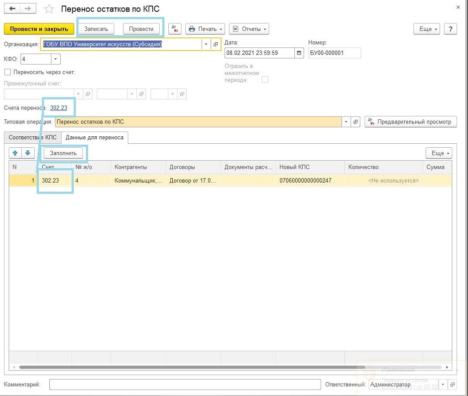 4. Теперь нужно перейти во вкладку "Данные для переноса" и нажимаем Заполнить. После этого табличная часть заполнится остатками по счету, который выбран в реквизите "Счета переноса" (302.23). После нужно нажать "Записать" и "Провести" документ.