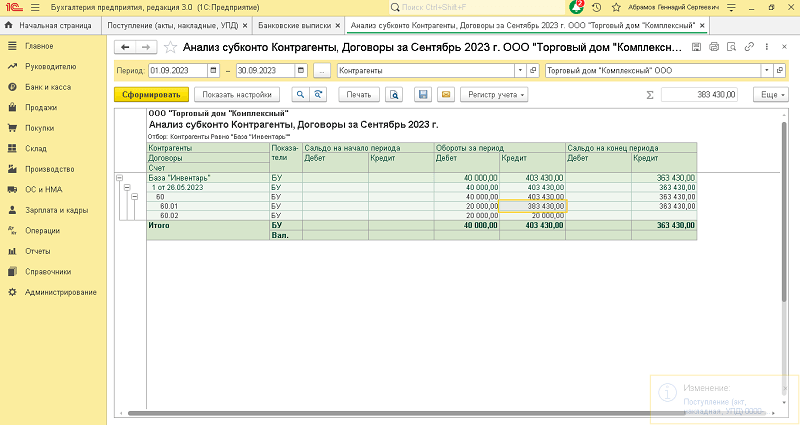 В некоторых случаях, например, когда были ручные корректировки в начале года и перепроведение последнего документа не помогает, данный отчет также можно сформировать дополнительно в разрезе документов расчетов с контрагентами. В таком разрезе можно увидеть с какого документа началась проблема и с какого документа нужно перепровести документы.