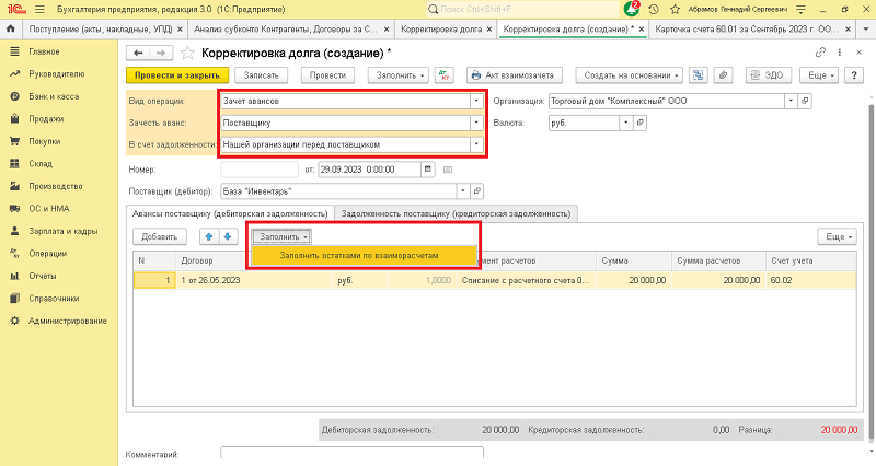 После перепроведения документа по отчету «Анализ субконто» видно, что зачет аванса был выполнен и в сальдо отражается реальная задолженность контрагенту.