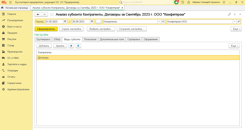 Для анализа взаиморасчетов с контрагентами лучше всего походит отчет «Анализ субконто» (раздел Отчеты – Анализ субконто с видом субконто «Контрагенты»). Чтобы получить отчет в разрезе нужных нам данных перейдем по кнопке «Настройка», выберем вкладку Группировка и установим галочку «по субсчетам», а на вкладке «Виды субконто» и добавим вид субконто «Договоры»