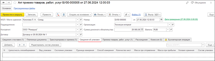 Информация, указанная на закладке «Сведения об упаковке», используется при формировании раздела 3 "Сведении о целостности пломб, упаковки, количестве мест и массе груза" Акта приемки (ф. 0510452).