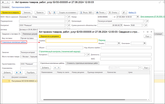 3. По гиперссылке «Строительно-монтажные работы (рисунок 3) открывается форма, реквизиты которой используются для заполнения раздела 6 "Сведения о строительно-монтажных работах" Акта приемки (ф. 0510452).