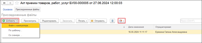 13. После сохранения документа «Акт приемки товаров, работ, услуг» по кнопке «Внутр.ЭДО» или «Печать» можно сформировать «Акт приемки товаров, работ, услуг» (ф. 0510452).