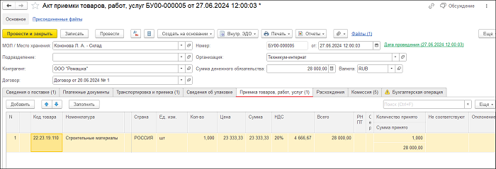 Казенное учреждение заключило договор с ООО "Ромашка" на поставку строительных материалов. Договором предусмотрена приемка товара. Договор не размещается в ЕИС в сфере закупок. Поставка и приемка товара проводятся в один день - 27.06.2024. Принимает товар приемочная комиссия. При приемке количественных и качественных отклонений между поставленным товаром и сопроводительными документами поставщика не выявлено. Ответственный исполнитель из состава приемочной комиссии оформил акт приемки товаров, работ, услуг (ф. 0510452). Копия акта (ф. 0510452) на бумажном носителе подписана представителем поставщика, скан-копия приложена к электронному акту приемки (ф. 0510452).