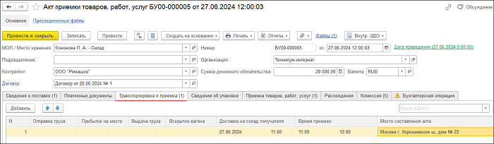 5. На закладке «Транспортировка и приемка» (рисунок 5) указываются реквизиты: