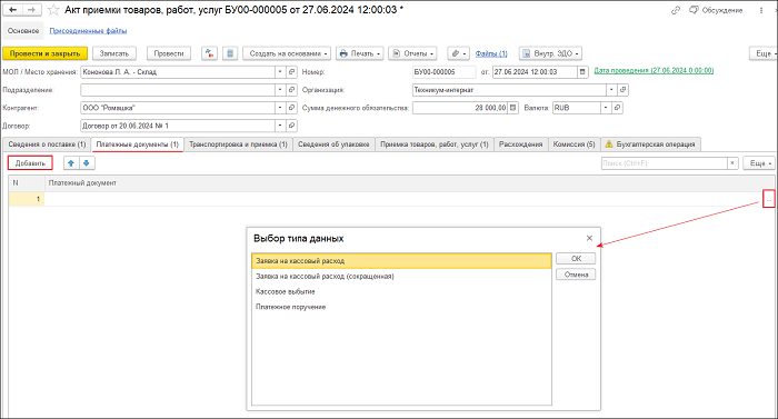 9. На закладке «Комиссия» из справочника «Комиссии» подбирается приемочная комиссия, принимающая товары, работы, услуги.