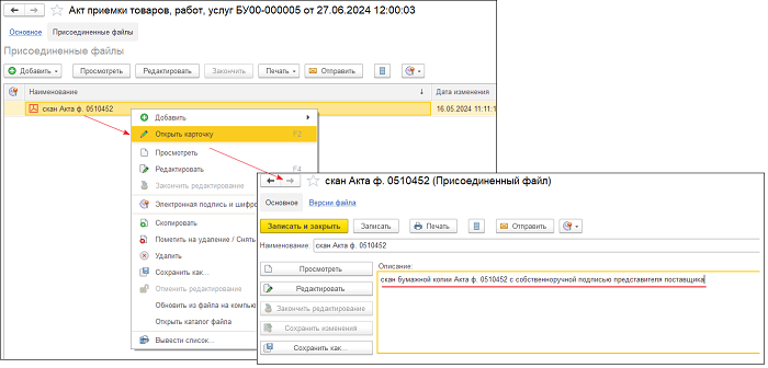 12. Чтобы в «Приложении» отражалось наименование документа, следует перейти в присоединенные файлы, нажать на правую кнопку мыши и выбрать команду «Открыть карточку», в поле описание заполнить наименование файла. Также в карточку файла можно перейти при нажатии на строку «наименование документа» строки «Приложение» при просмотре ЭД или печатной формы (рисунок 11).