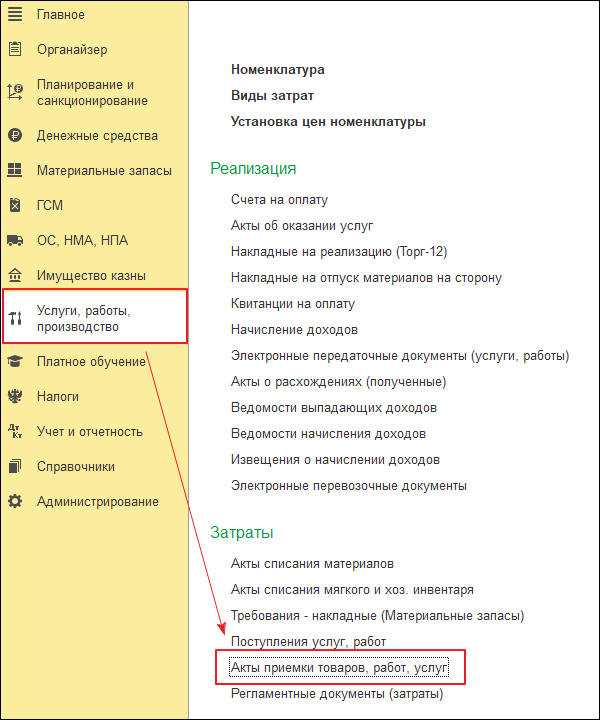 1. Для формирования Акта приемки товаров, работ, услуг (ф. 0510452) применяется документ «Акт приемки товаров, работ, услуг» (раздел «Услуги, работы, производство» - «Затраты») (рисунок 1). Также документ «Акт приемки товаров, работ, услуг» можно сформировать на основании документов поступления НФА, работ, услуг (Поступление МЗ, Поступление ОС, НМА, НПА, Поступление услуг, работ).