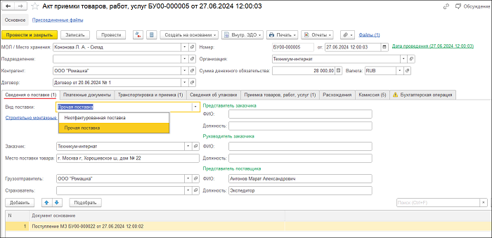 - Вид поставки - может принимать значения «Неотфактурованная поставка» и «Прочая поставка». При выборе значения «Неотфактурованная поставка» становятся доступными закладки «Зачет авансов», «Денежные обязательства и типовая операция» на закладке «Бухгалтерская операция». При использовании этого вида поставки «Акт приемки товаров, работ, услуг» формирует проводки по принятию кредиторской задолженности за счет сформированного резерва (дебет 401 60 кредит 302 ХХ), принятию денежных обязательств и корректировке отложенных обязательств. При выборе значения «Прочая поставка» документ «Акт приемки товаров, работ, услуг» используется для создания формы документа «Акта приемки» (ф. 0510452) и проводок не формирует;